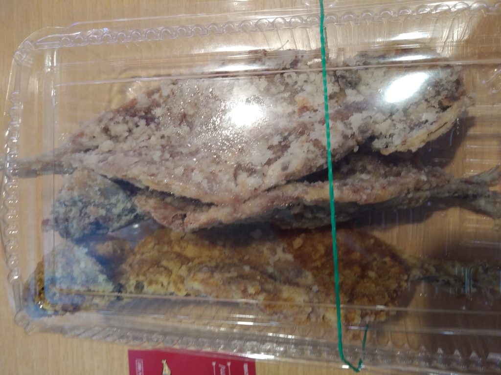 上から塩、ゆず胡椒、カレー味の鯵の唐揚げです。塩はその場で食べましたがとても美味しかったです!