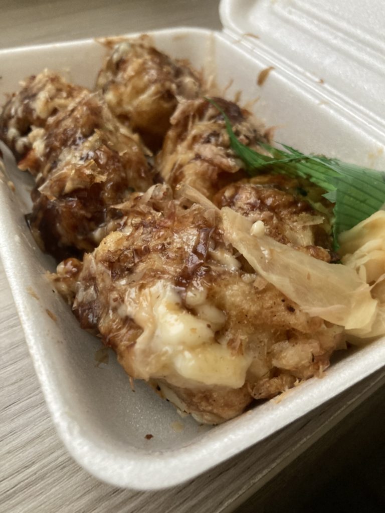 気付いたら箱が斜めになっていてたこ焼きが端に寄ってしまっていて見た目は良くないですが、ふわふわトロトロでこちらも非常に美味しかったです!